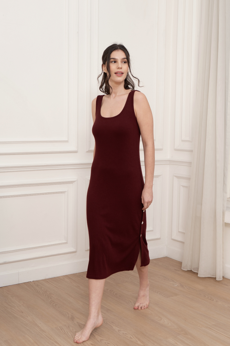 Lydia, a super comfortable slip-on knit dress with built-in bra paddings. It's meticulously made to look like a bodycon dress BUT designed with more room at the hips for more comfort or to flatter our post-partum figures. It has a reversible neckline so you can switch up the look and functional buttons on the sides. Undo the buttons for more space to house that baby bump or make it easier to sit down in comfortable positions when lounging.