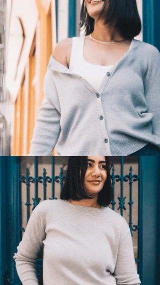 Designed with quiet intention, it’s completely reversible: wear the ceramic-button side forward as a classic cardigan or flip it around for a clean, minimal pullover. Breathable enough to be worn on its own as a top, or layered open over your everyday looks.