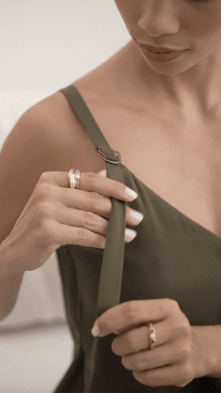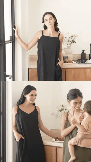 Hannah, a flowy A-line must-have classic dress. Designed with a reversible neckline for different occasions: V-neckline for a more relaxed or sexier vibe, and high straight neckline that's more conservative or more appropriate for work. For mothers, it's spacious enough for a growing baby bump and still looks effortlessly stylish after birth.